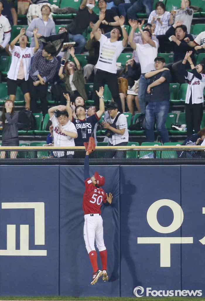 | △ 김재환의 홈런 타구 잡으려는 KIA 오준혁 |
