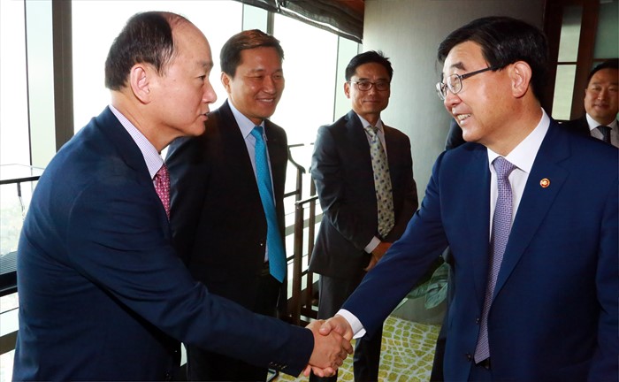 (서울=포커스뉴스) 이기권 고용노동부 장관이 17일 베트남 하노이 롯데호텔에서 현지에 진출한 우리 기업 임원들과 간담회를 갖고, 애로사항을 청취하며 격려했다. 이 장관이 참석자와 악수를 하고 있다. <사진제공=고용노동부>