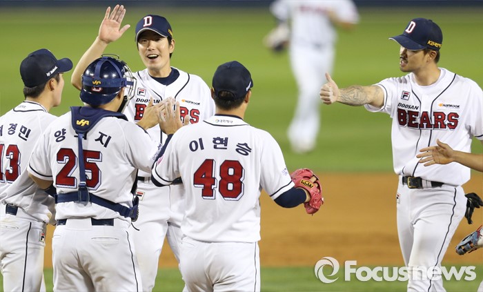 (서울=포커스뉴스) 17일 서울 잠실구장에서 열린 2016프로야구 KIA-두산 경기 9회초 1사 2루에서 KIA 대타 황대인이 좌익수 왼쪽으로 빠지는 1타점 2루타를 치고 2루 베이스 위에 수줍은 미소를 띠며 서 있다.
