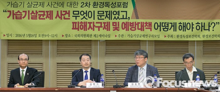 (서울=포커스뉴스) 18일 오전 서울 여의도 국회 의원회관에서 열린 가습기 살균제 사건에 대한 2차 환경독성포럼에 참석한 내빈들이 자리하고 있다. 왼쪽부터 정연만 환경부 차관, 김판기 한국환경보건학회장, 임종한 환경독성보건학회장, 백도명 서울대보건대학원 교수.