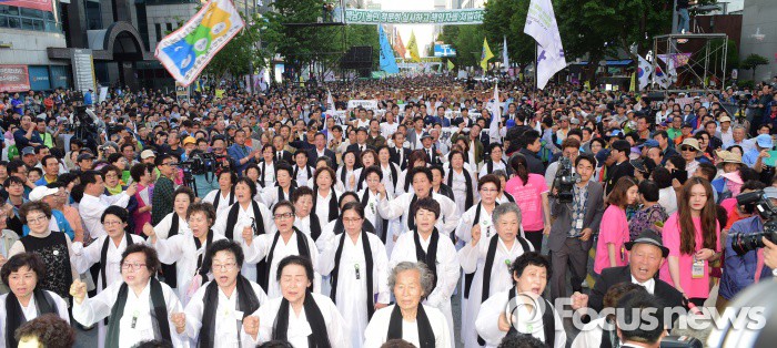 정부 대표로 참석한 황교안 국무총리는 자리에서 일어났지만 노래를 따라 부르지는 않았다.5·18 민주화운동 기념식이 18일 오전 광주에서 열린 가운데 제창 여부에 관심이 모아졌던 '임을 위한 행진곡'이 끝내 합창됐다. 사진은 5.18 민주화운동 36주년을 하루 앞둔 17일 오후 광주 동구 금남로 민주광장에서 열린 '5·18 민주항쟁 전야제' 참석자들과 시민들이 임을 위한 행진곡을 외치고 있는 모습이다. 2016.05.17 신홍관 기자2016.05.18 신홍관 기자