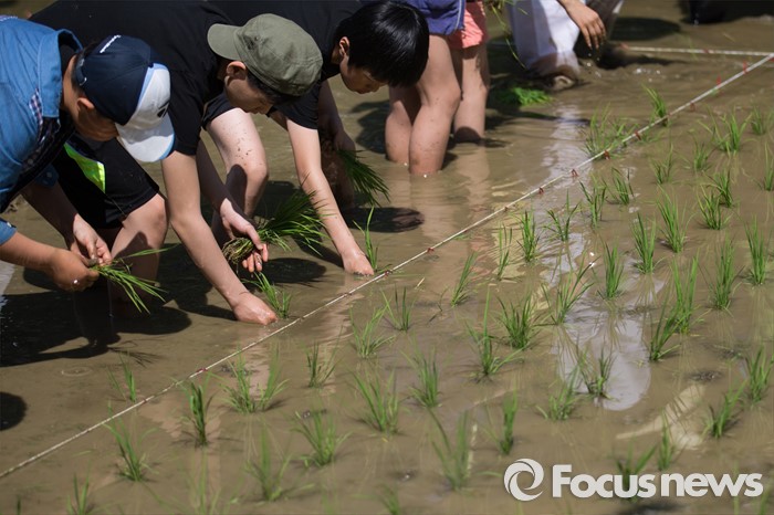 (서울=포커스뉴스) 18일 오전 서울 강남구 양재천 영동4교 인근 벼농사학습장에서 열린 전통 모내기 체험 행사에 참가한 어린이들이 모내기를 하고 있다.