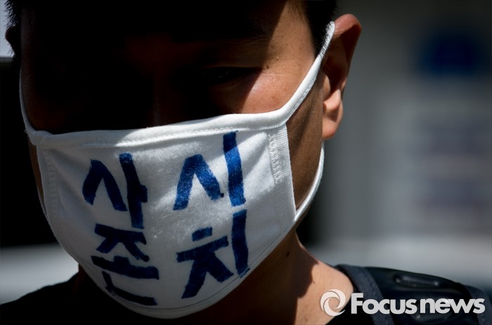 (서울=포커스뉴스) 18일 오전 서울 여의도 더불어민주당사 앞에서 사법시험 존치를 위한 고시생모임이 사시존치 법안의 법제사법위원회 전체회의 상정을 가로막은 더불어민주당 규탄시위를 하고 있다.