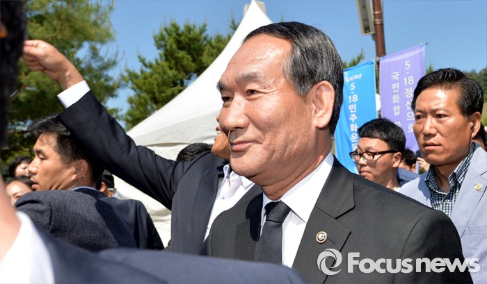 (광주=포커스뉴스) 36주년 5·18민주화운동 기념식이 거행된 18일 오전 광주 북구 운정동 5·18민주묘지에서 행사장에 참석하려는 박승춘 보훈처장이 5월 유가족의 항의를 받고 기념식장을 떠나고 있다.