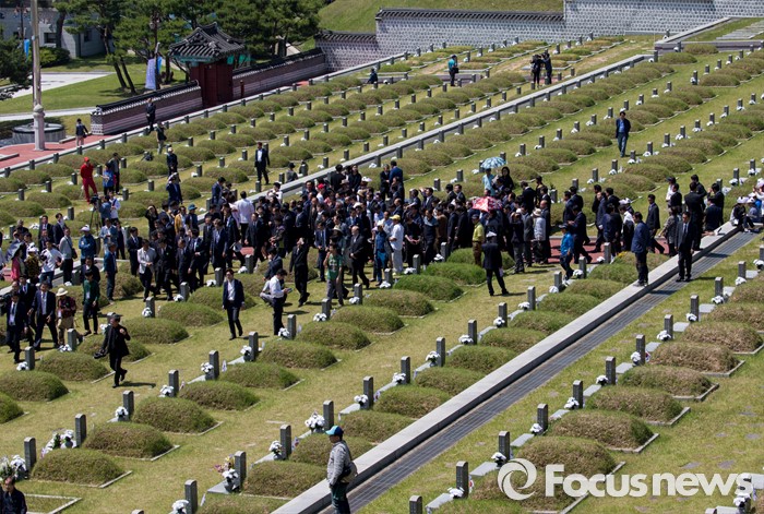 (광주=포커스뉴스) 36주년 5·18민주화운동 기념식이 거행된 18일 오전 광주 북구 운정동 5·18민주묘지가 손학규 전 더불어민주당 상임고문과 취재진으로 붐비고 있다.