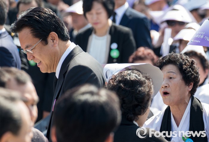 (광주=포커스뉴스) 36주년 5·18민주화운동 기념식이 거행된 18일 오전 광주 북구 운정동 5·18민주묘지에서 정진석 새누리당 원내대표가 유가족의 항의를 받고 있다.