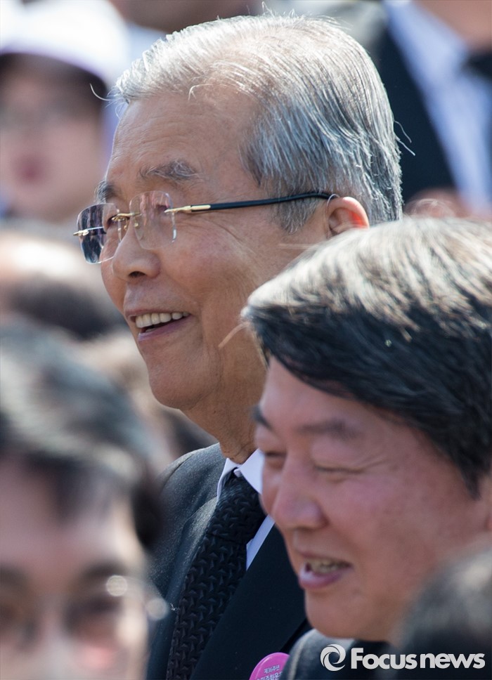 (광주=포커스뉴스) 36주년 5·18민주화운동 기념식이 거행된 18일 오전 광주 북구 운정동 5·18민주묘지에서 김종인 더불어민주당 비대위 대표와 안철수 국민의당 상임공동대표가 미소짓고 있다.