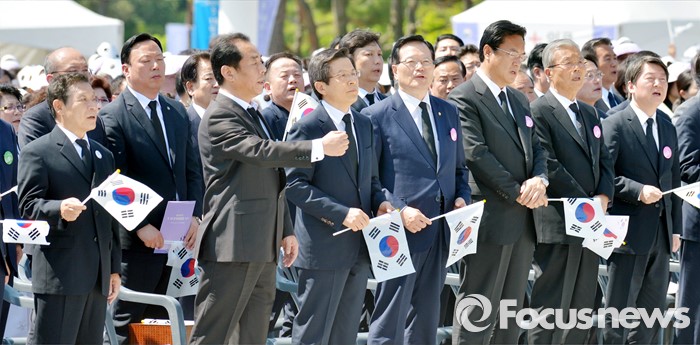 (광주=포커스뉴스) 36주년 5·18민주화운동 기념식이 거행된 18일 오전 광주 북구 운정동 5·18민주묘지에서 황교안 국무총리를 제외한 여야 지도부와 참석자들이 '임을 위한 행진곡'을 부르고 있다.