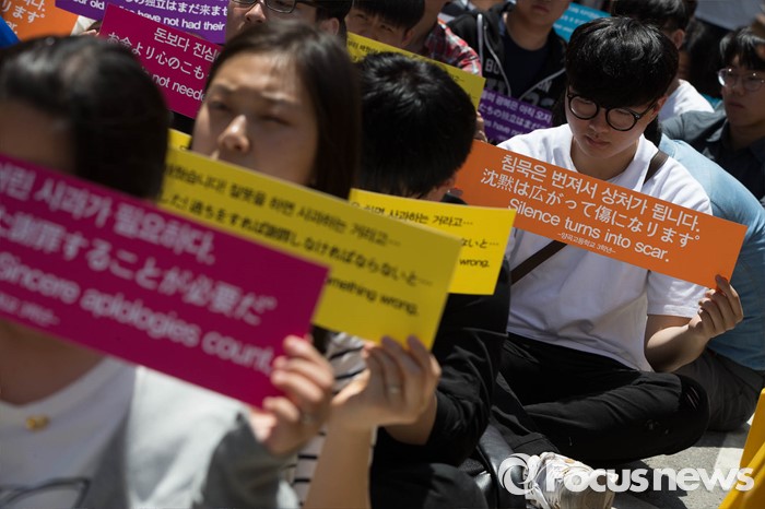 (서울=포커스뉴스) 18일 오후 서울 종로구 옛 일본대사관 앞에서 열린 '제1231차 일본군 위안부 문제해결을 위한 정기 수요시위'에 참석한 학생들이 일본의 사과를 촉구하는 손펫말을 들고 있다.