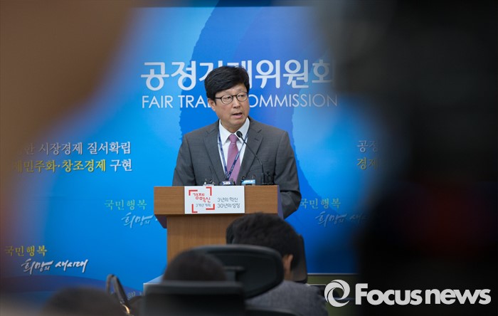 (세종=포커스뉴스) 김재신 공정거래위원회 기업거래정책국장이 18일 오전 세종시 정부세종청사 공정위 기자실에서 대형마트 3사의 대규모유통업법 위반으로 총 238억 원의 과징금을 부과했다고 밝히고 있다.
