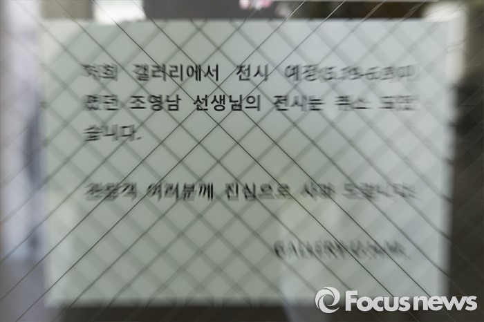 (서울=포커스뉴스) 18일 오후 서울 용산구 갤러리 U.H.M 입구에 조영남 전시회 취소 안내문이 붙어있다. 조영남은 무명화가 A씨가 지난 8년간 조영남의 그림 300여점을 대신 그렸다는 대작 의혹을 제기하면서 검찰의 압수수색을 받은 것으로 알려졌다.