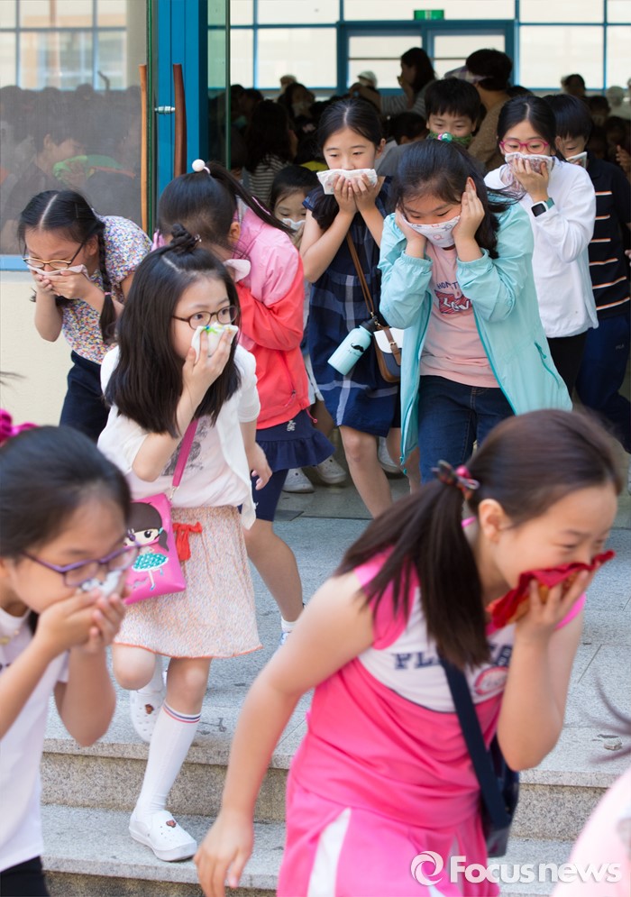 (공주=포커스뉴스) 18일 오후 충남 공주 신월초등학교에서 2016 재난대응 안전한국훈련 일환으로 실시된 현장대응 훈련에서 가스폭발로 인한 화재 발생을 가정, 학생들이 대피훈련을 하고 있다.