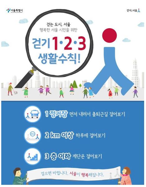 서울시는 이를 위해 시민들이 온라인을 중심으로 걷기와 관련해 의견을 올릴 수 있도록 '걷기 생활 수칙 시민아이디어 공모전'도 함께 시행한다.