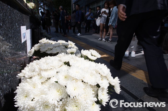 (서울=포커스뉴스) 18일 서울 서초구 강남역 10번출구에서 시민들이 '묻지마 살인' 피해자를 추모하고 있다.