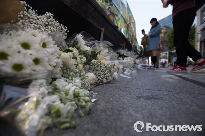 (서울=포커스뉴스) 18일 서울 서초구 강남역 10번출구에서 시민들이 '묻지마 살인' 피해자를 추모하고 있다.