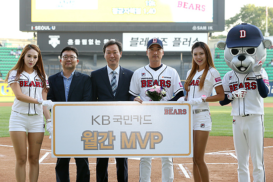 이들은 부상으로 KB국민 기프트카드 100만원권을 각각 받았다.프로야구 두산 투수 정재훈(왼쪽에서 네번째)이 17일 잠실 KIA전에 앞서 'KB국민카드' 4월 월간 최우수선수(MVP) 시상식에 참석해 KB국민카드 기업카드사업부 정경일 부장(왼쪽에서 세번째)과 기념촬영하고 있다. <사진제공=두산 베이스>