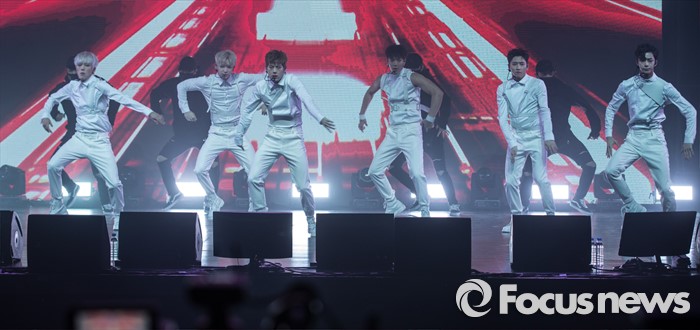 (서울=포커스뉴스) 18일 오후 서울 광진구 예스24 라이브홀에서 열린 아이돌그룹 몬스타엑스의 세번째 미니앨범 'THE CLEAN PART. 1 LOST' 발표 쇼케이스에 참석한 멤버들이 신곡 '걸어l'의 무대를 선보이고 있다.
