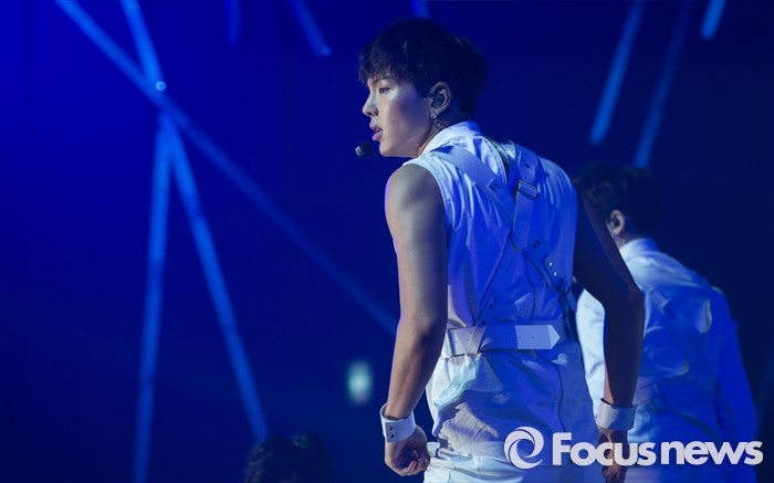 (서울=포커스뉴스) 18일 오후 서울 광진구 예스24 라이브홀에서 열린 아이돌그룹 몬스타엑스의 세번째 미니앨범 'THE CLEAN PART. 1 LOST' 발표 쇼케이스에 참석한 멤버 셔누가 이 신곡 '걸어l'의 무대를 선보이고 있다.