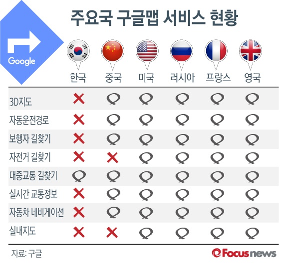 한국에서 제공되는 구글맵 서비스에선 3D 지도와 자동차 운전경로, 실시간 교통상황 등이 제공되지 않는다. 대중교통 정보만 제공된다. 이는 미국·영국·프랑스는 물론 러시아·중국보다 더 높은 수준의 규제다.