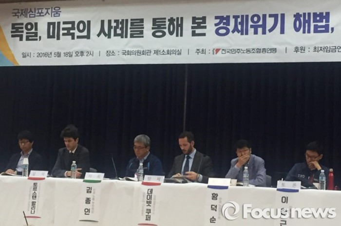 전국민주노동조합총연맹은 18일 오후 서울 영등포구의 국회 의원회관에서 '독일 미국의 사례를 통해 본 경제위기 해법, 최저임금 인상' 토론회를 열었다.