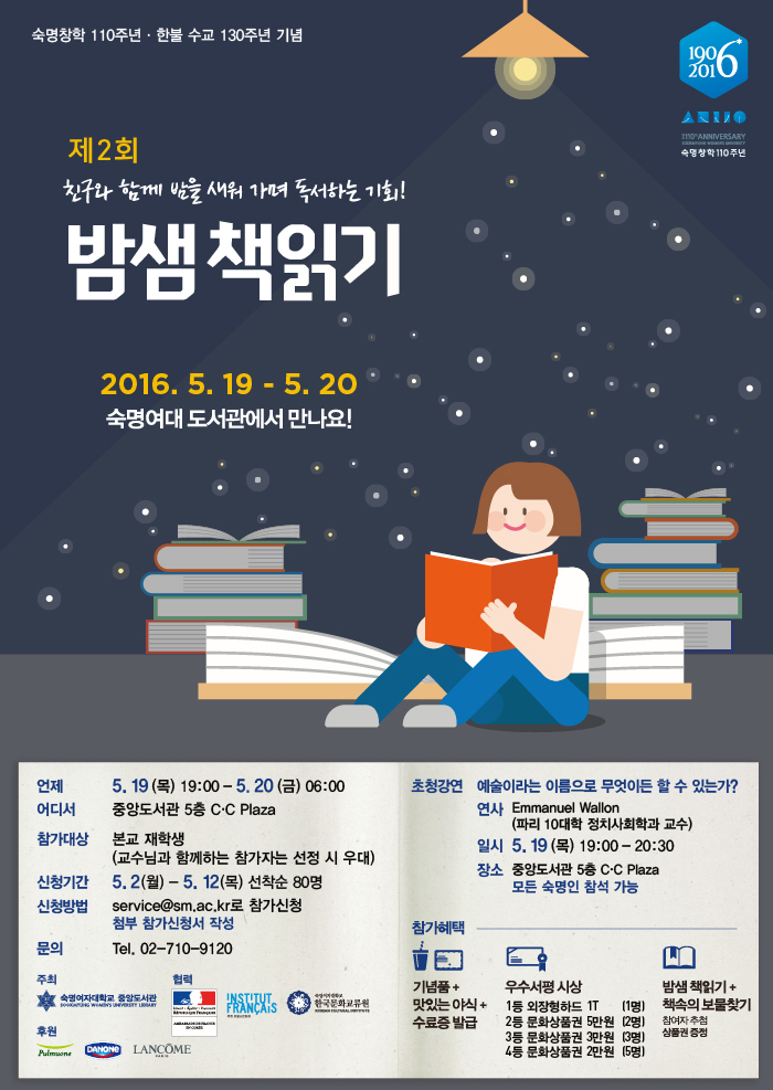 (서울=포커스뉴스) 숙명여자대학교는 창학 110주년과 한불 수교 130주년을 기념하는 '숙명의 미래, 책으로 열다 - 제2회 밤샘 책읽기' 행사를 연다고 18일 밝혔다.
