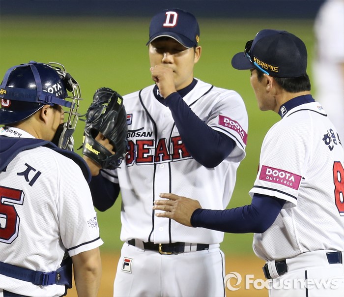 (서울=포커스뉴스) 18일 서울 잠실구장에서 열린 2016프로야구 KIA-두산 경기 5회초 두산 선발 장원준이 백투백 홈런을 맞자 한용덕 투수코치가 마운드에 올라가 진정시키고 있다.