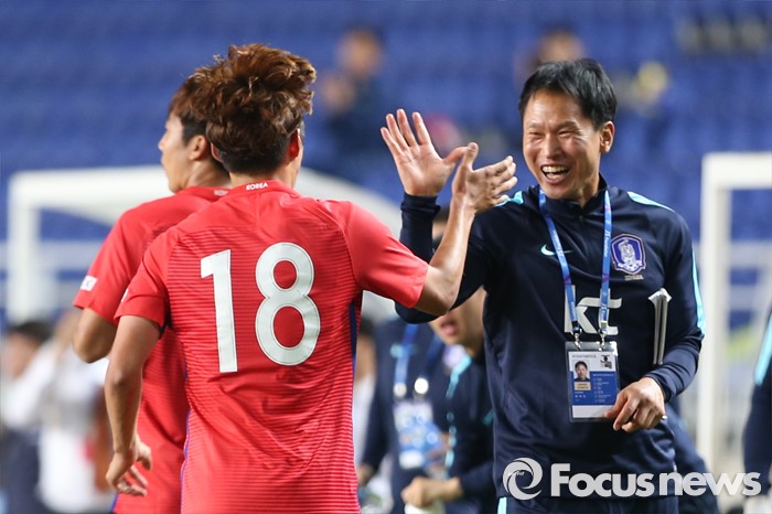 (수원=포커스뉴스) 18일 오후 경기도 수원시 수원월드컵경기장에서 열린 2016 수원 JS컵 U-19 국제청소년축구대회 대한민국과 브라질의 경기에서 한찬희가 전반전 동점골을 넣고 안익수 감독과 기뻐하고 있다.