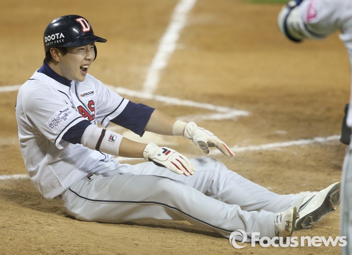 (서울=포커스뉴스) 18일 서울 잠실구장에서 열린 2016프로야구 KIA-두산 경기 6회말 2사 1루에서 두산 오재원의 2루타때 1루주자 박건우가 홈에서 슬라이딩, 득점후 안도의 웃음을 짓고 있다.