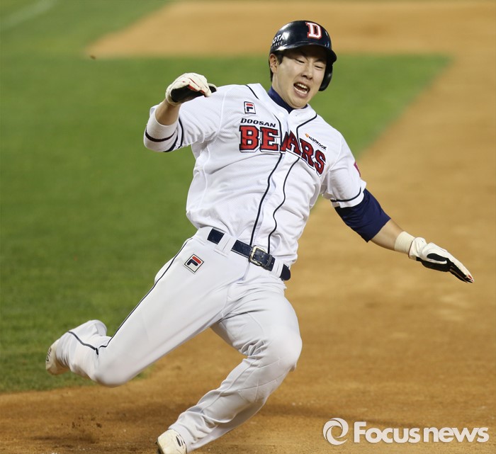 (서울=포커스뉴스) 18일 서울 잠실구장에서 열린 2016프로야구 KIA-두산 경기 6회말 2사 1루에서 두산 오재원의 2루타때 1루주자 박건우가 홈에서 슬라이딩, 득점후 안도의 웃음을 짓고 있다.