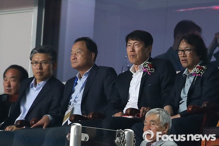 (수원=포커스뉴스) 18일 오후 경기도 수원시 수원월드컵경기장에서 열린 2016 수원 JS컵 U-19 국제청소년축구대회 대한민국과 브라질의 경기에서 차범근(오른쪽 두번째) 피파20세월드컵 조직위원회 부위원장이 관람하고 있다.
