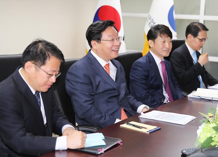(서울=포커스뉴스) 주형환 산업통상자원부 장관이 18일 서울 정부서울청사 외교부 집무실에서 모하메드 빈 하메드 빈 싸이프 알 룸히(Mohammed bin Hamed bin Saif Al-Rumhy) 오만 석유가스부 장관의 예방을 받고, 한-오만 양국간 석유·가스분야의 협력 강화와 오일·가스 프로젝트 협력 등에 관해 의견을 교환하고 있다. <사진제공=산업통상자원부>