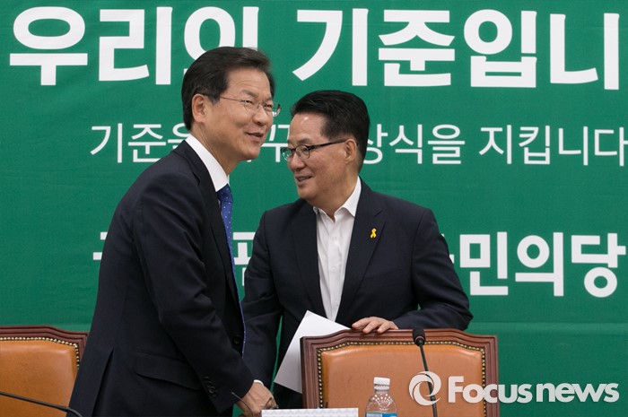 (서울=포커스뉴스) 19일 오전 서울 여의도 국회에서 열린 국민의당 의원총회에 참석한 천정배(왼쪽) 공동대표와 박지원 원내대표가 인사한 뒤 자리로 향하고 있다.
