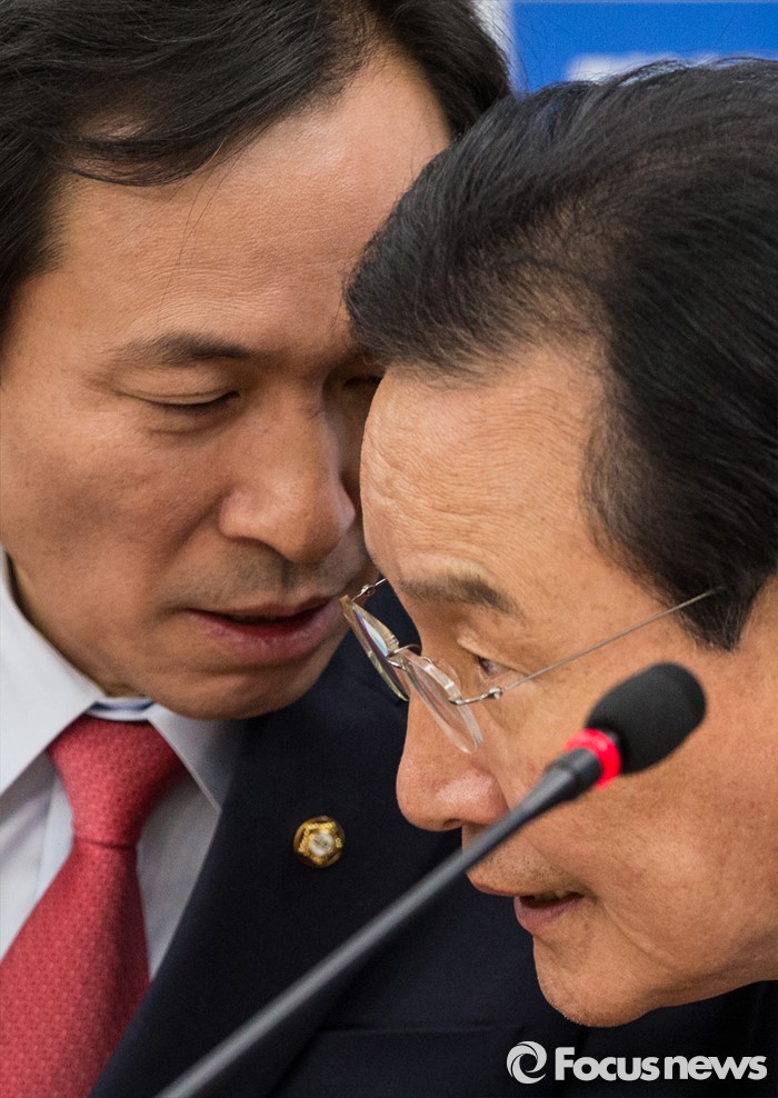 (서울=포커스뉴스) 19일 오전 여의도 국회에서 열린 더불어민주당 원내대표단 회의에 참석한 우상호(왼쪽) 신임 원내대표와 변재일 정책위의장이 대화하고 있다.