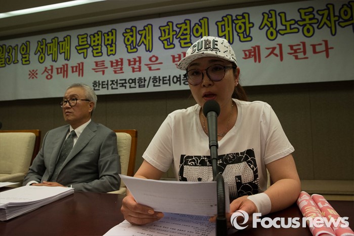 (서울=포커스뉴스) 19일 오전 서울 종로구 프레스센터에서 장세희 한터여종사자연맹대표가 '성매매 특별법 헌재 판결에 대한 성 노동자 기자회견'에 참석해 발언하고 있다.