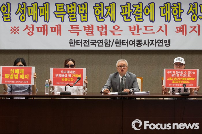 (서울=포커스뉴스) 19일 오전 서울 종로구 프레스센터에서 열린 '성매매 특별법 헌재 판결에 대한 성 노동자 기자회견'에 참석한 강현준 한터전국연합대표가 발언하고 있다.