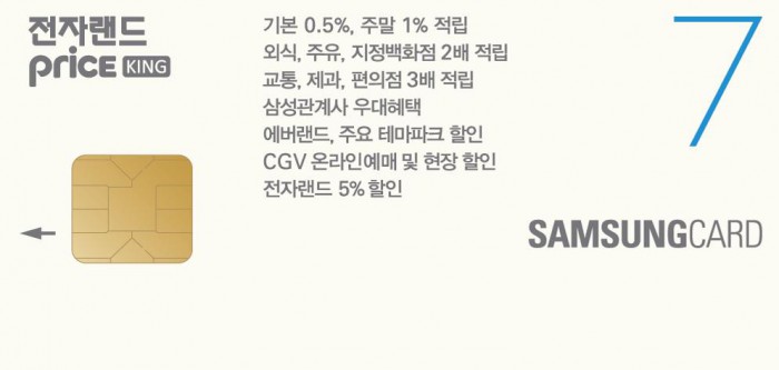 한편, 2014년 4월 선보인 '전자랜드 삼성카드7'를 전자랜드에서 사용하면 5% 청구할인과 포인트 적립 혜택뿐 아니라 삼성카드 포인트로 100% 결제가 가능하다.'전자랜드 삼성카드7'.<사진제공=전자랜드>