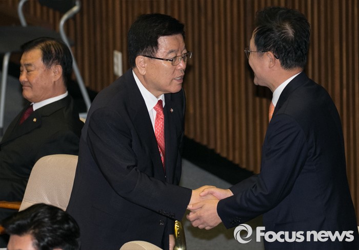 (서울=포커스뉴스) 19일 오전 서울 여의도 국회에서 열린 342회 국회(임시회) 1차 본회의에 참석한 김광림(오른쪽 두번째) 새누리당 정책위의장과 청와대 경제수석으로 임명된 강석훈(오른쪽) 의원이 인사하고 있다.
