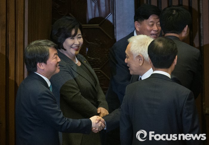 (서울=포커스뉴스) 19일 오전 서울 여의도 국회에서 열린 342회 국회(임시회) 1차 본회의에서 안철수 국민의당 대표와 김한길 의원이 인사를 나누고 있다.