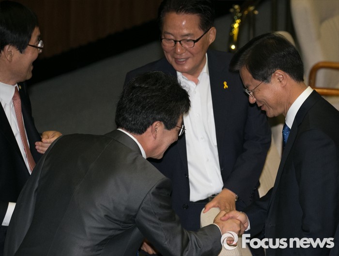 (서울=포커스뉴스) 19일 오전 서울 여의도 국회에서 열린 342회 국회(임시회) 1차 본회의에 참석한 천정배(오른쪽) 국민의당 공동대표, 박지원(오른쪽 두번째) 원내대표와 유승민(오른쪽 세번째) 무소속 의원이 인사하고 있다.