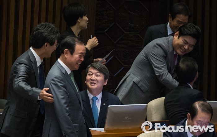 (서울=포커스뉴스) 19일 오전 서울 여의도 국회에서 열린 342회 국회(임시회) 1차 본회의에서 유승민(왼쪽) 무소속 의원이 안철수(가운데) 국민의당 대표와 대화하고 있다. 왼쪽 두번째는 장병완 국민의당 의원