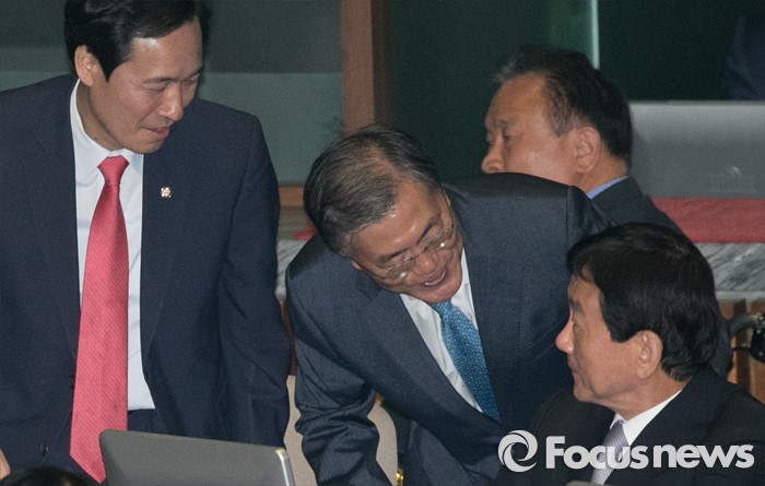 (서울=포커스뉴스) 19일 오전 서울 여의도 국회에서 열린 342회 국회(임시회) 1차 본회의에 참석한 문재인(가운데) 더불어민주당 전 대표와 우상호(왼쪽) 원내대표, 진영 의원이 인사하고 있다.
