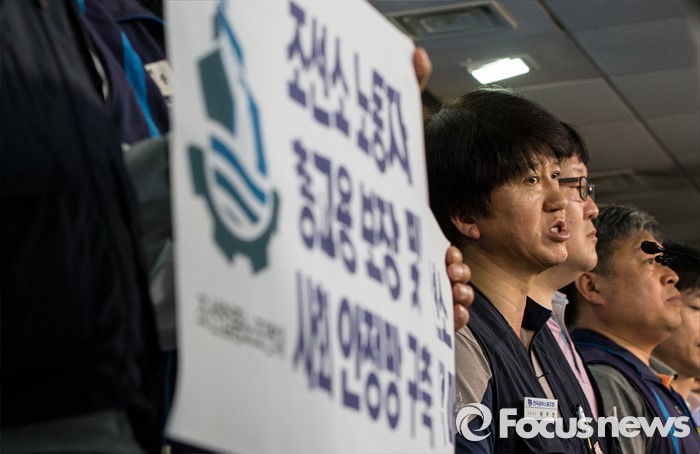 (서울=포커스뉴스) 19일 오전 여의도 국회 정론관에서 열린 '조선산업 발전과 구조조정에 관한 조선업종노조연대 대표자' 기자회견에 참석한 황우찬 전국금속노조 부위원장이 발언하고 있다.