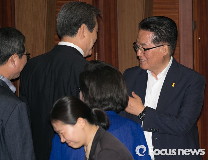 (서울=포커스뉴스) 19일 오전 서울 여의도 국회에서 열린 342회 국회(임시회) 1차 본회의에 참석한 김무성(왼쪽) 새누리당 전 대표와 박지원 국민의당 원내대표가 대화하고 있다.