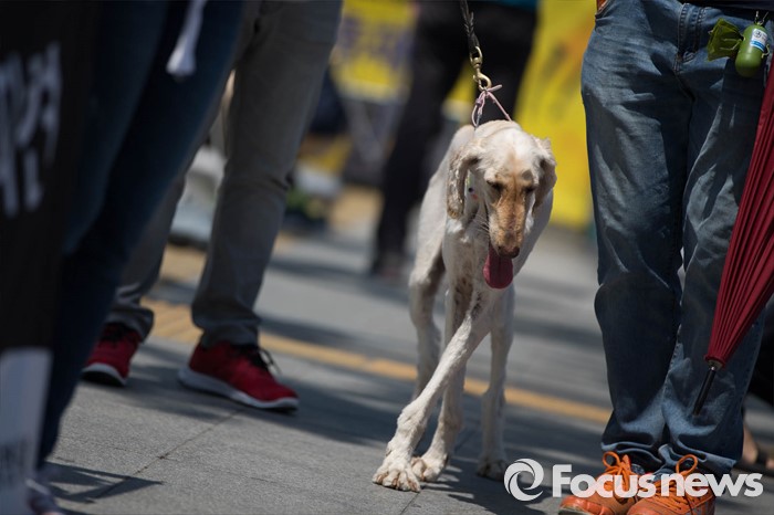 (서울=포커스뉴스) 19일 오후 서울 종로구 정부서울청사앞에서 동물자유연대 및 시민단체들이 강아지 공장 문제 해결을 촉구하며 기자회견을 하고 있다. 실제 '강아지 공장'에서 새끼를 낳던 강아지 신디가 기자회견장에 들어서고 있다.
