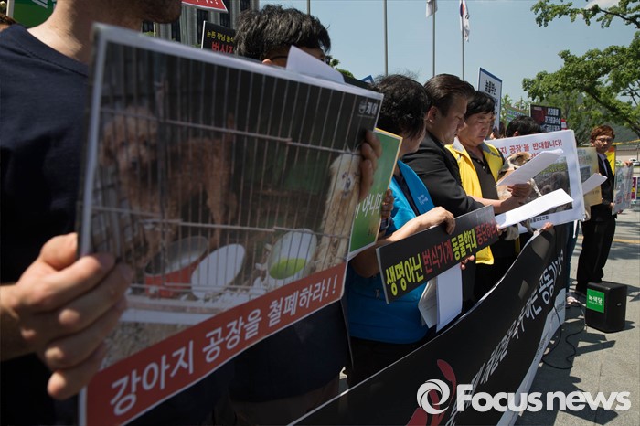 (서울=포커스뉴스) 19일 오후 서울 종로구 정부서울청사앞에서 동물자유연대 및 시민단체들이 강아지 공장 문제 해결을 촉구하며 기자회견을 하고 있다.