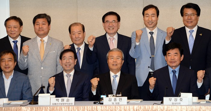 (서울=포커스뉴스) 19일 오전 서울 여의도 국회 귀빈식당에서 열린 20대 국회 무엇을 할 것인가?, 자치분권의 정책과제에 참석한 김종인 더불어민주당 비대위 대표, 박원순 서울시장, 기초단체장과 의원 및 당선인들이 기념촬영을 하고 있다. <사진제공=더불어민주당>