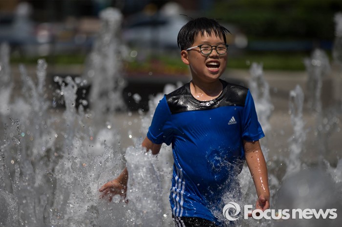 (서울=포커스뉴스) 서울의 낮 기온이 30도를 넘는 19일 오후 서울 광화문광장 분수대에서 아이들이 물놀이를 즐기고 있다.