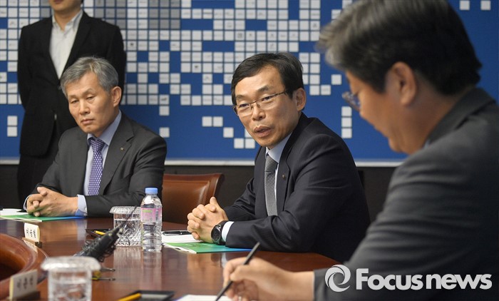 (서울=포커스뉴스) 현장조사에 나선 이춘석(오른쪽) 더불어민주당 어버이연합 등 불법 자금 지원 의혹 규명 진상조사 태스크포스(TF) 위원장이 19일 오후 서울 여의도 전국경제인연합회관에서 이승철(가운데) 상근부회장의 발언을 듣고 있다.