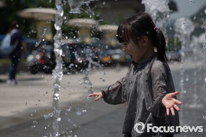 (서울=포커스뉴스) 서울의 낮 기온이 30도를 넘는 19일 오후 서울 광화문광장 분수대에서 아이들이 물놀이를 즐기고 있다.