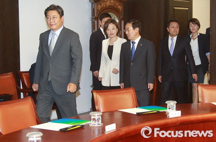 (서울=포커스뉴스) 현장조사에 나선 이춘석(왼쪽) 더불어민주당 어버이연합 등 불법 자금 지원 의혹 규명 진상조사 태스크포스(TF) 위원장과 위원들이 19일 오후 서울 여의도 전국경제인연합회관에서 이승철 상근부회장 등과 간담회를 위해 입장하고 있다.